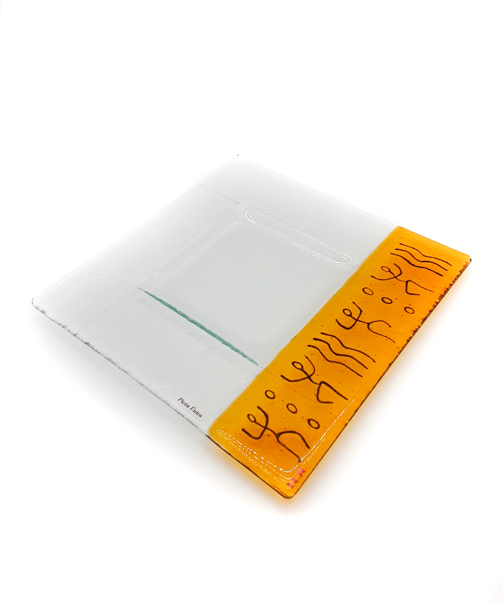 Bandeja cuadrada con diseño jeroglíficos en base transparente y marrón.