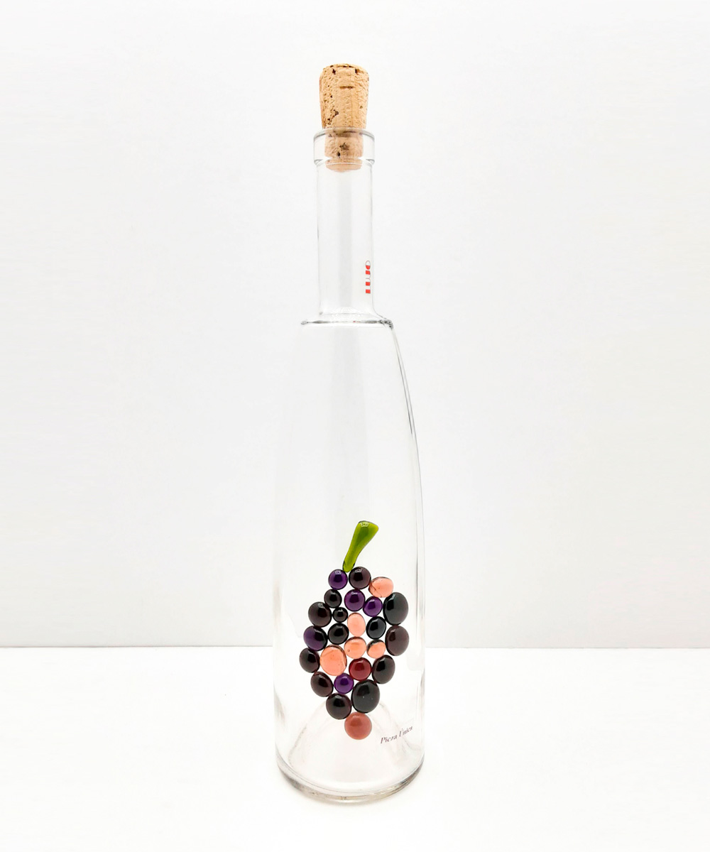 Botella de fabricación única, realizada en vidrio con detalle de racimo de uva en cristales de colores.