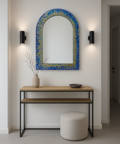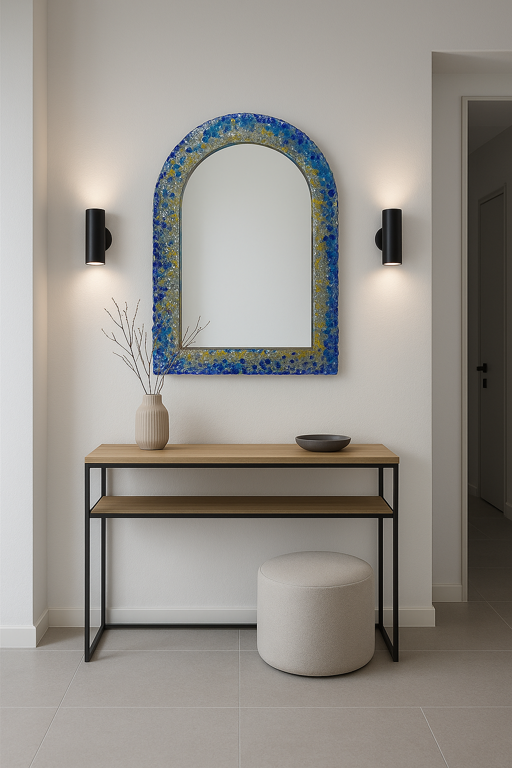 Haz que tu entrada hable por ti con nuestro espejo artesanal de cristal fusionado. Su marco vibrante en tonos azules y amarillos no solo ilumina tu espacio, sino que lo convierte en una verdadera obra de arte.