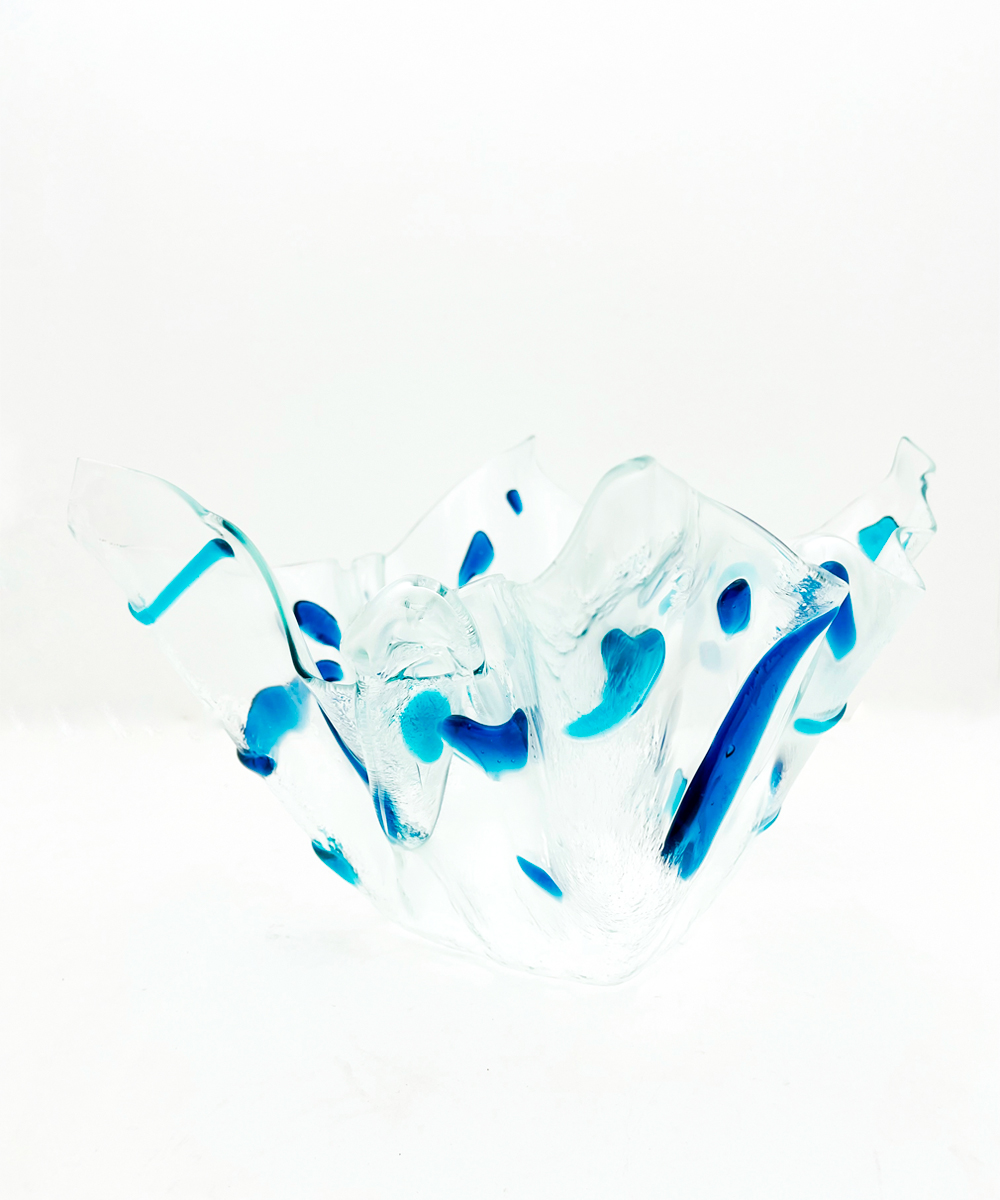 Frutero/Florero efecto paño con base incolora y trocitos en diferentes azules en vidrio masa.