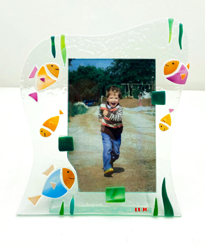 Marco de fotos fusión con peana. Fabricado en base float transparente y un diseño con peces de diferentes colores en vidrio flosing.
