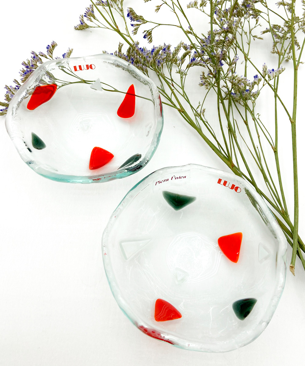 Pack de dos mini cuencos fabricados en base incolora y detalles en colores negro, blanco y rojo.