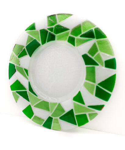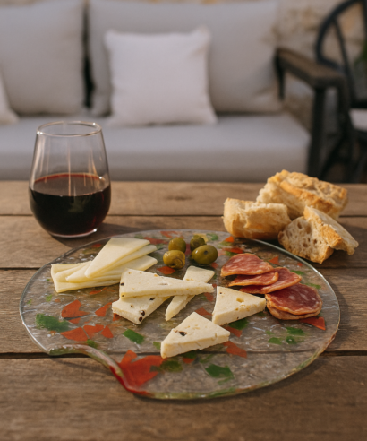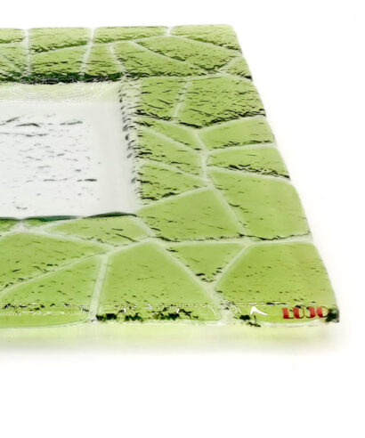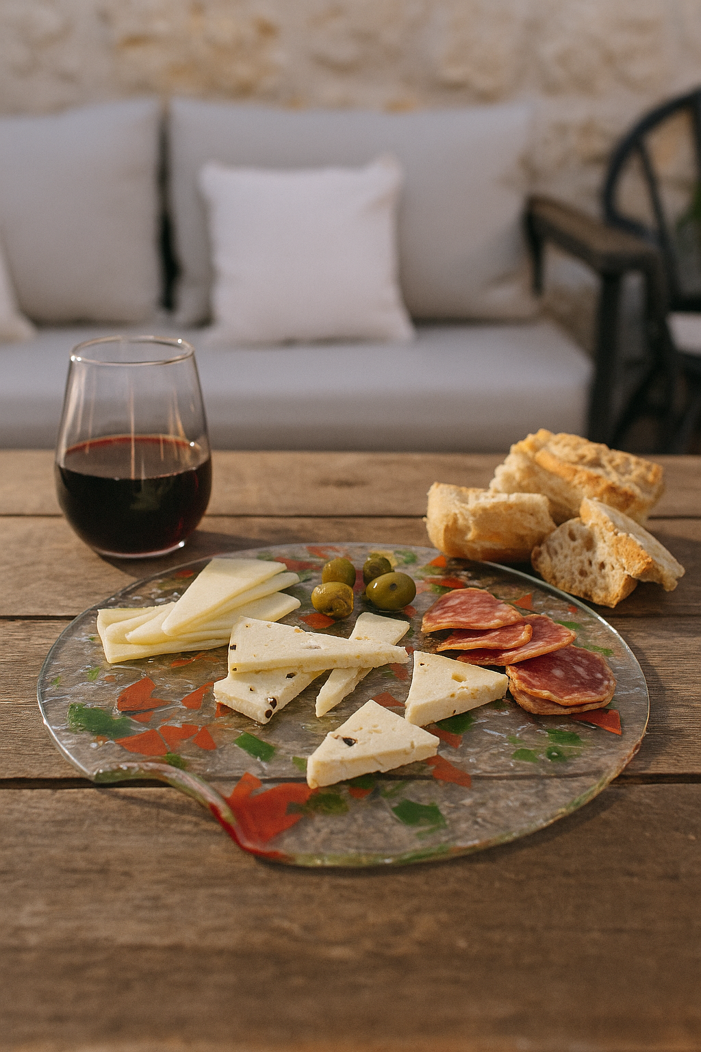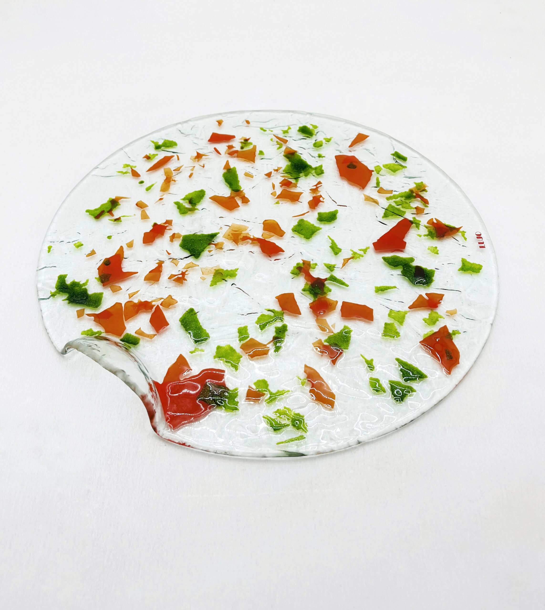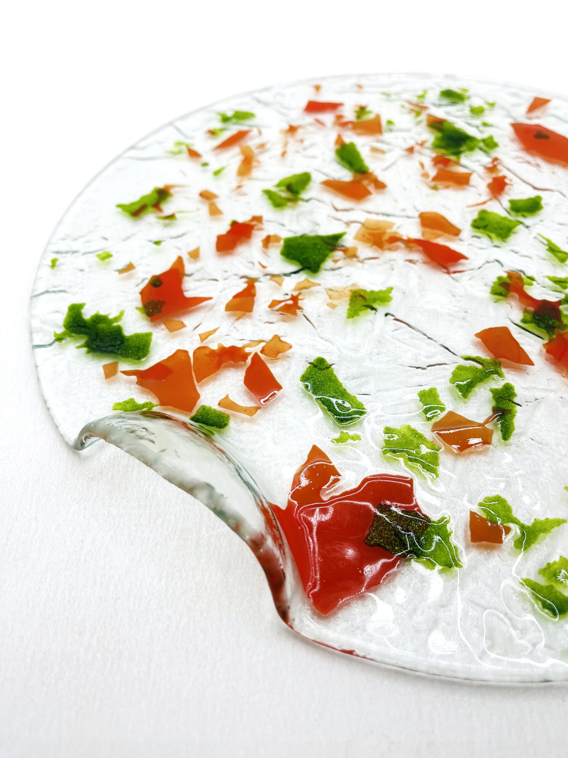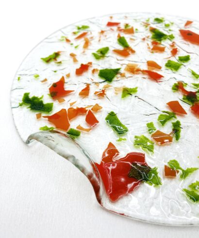 Una bandeja que no solo sirve, sorprende. Diseño artesanal en vidrio con detalles en rojo y verde que capturan la luz y el estilo. Perfecta para tus aperitivos, reuniones o simplemente para decorar tu mesa con arte.