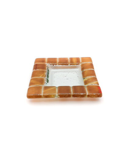 Una bandeja que no solo sirve, sorprende. Diseño artesanal en vidrio con detalles en rojo y verde que capturan la luz y el estilo. Perfecta para tus aperitivos, reuniones o simplemente para decorar tu mesa con arte.