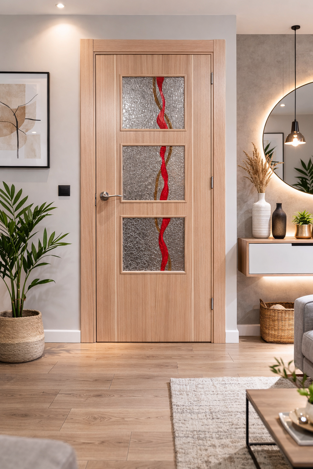 El vidrio Arosa aporta privacidad sin renunciar a la entrada de luz, mientras que el diseño orgánico en color crea un punto focal contemporáneo y sofisticado, ideal para puertas interiores en espacios modernos.