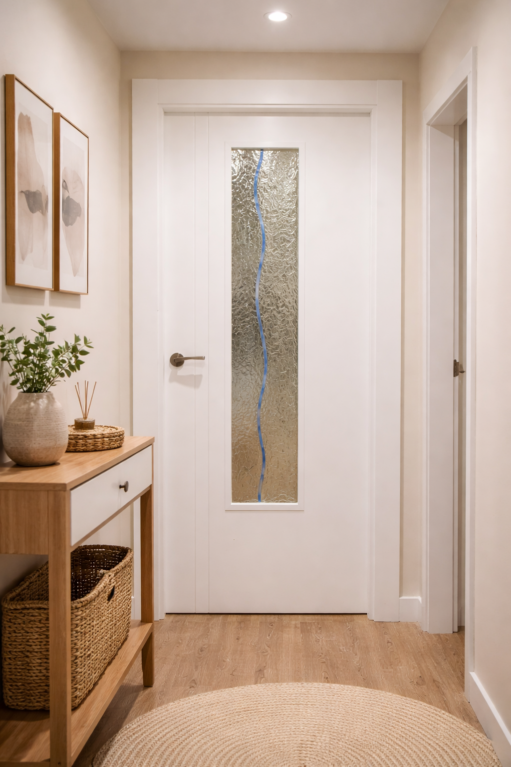 Este diseño apuesta por la elegancia minimalista: vidrio texturizado con una línea orgánica en color que aporta movimiento y personalidad a la puerta. Perfecto para quienes buscan un toque moderno sin recargar el espacio.