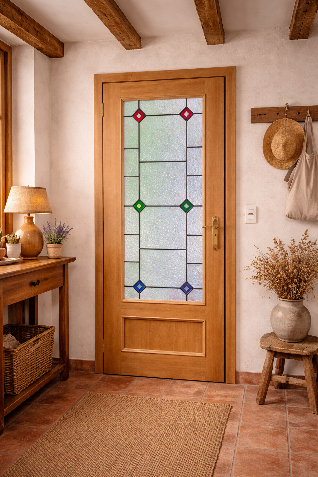 Aporta luz, color y personalidad a tu hogar con esta puerta de interior fabricada a mano, equipada con una elegante vidriera emplomada de diseño geométrico.